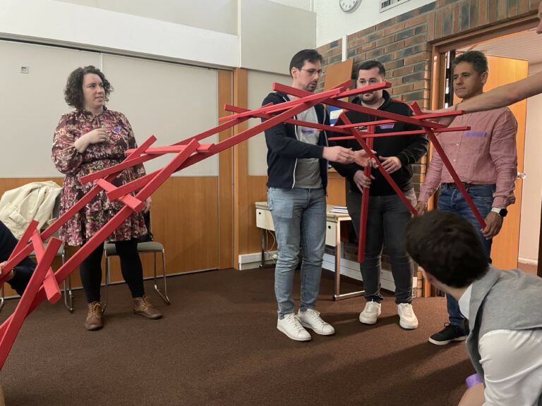 J’ai pu tester une grande variété d’ateliers, des jeux géants (comme le labyrinthe qui oblige 2 équipes à travailler ensemble pour en trouver le bout et le pont de Léonard où l’on doit créer un vrai pont en bois par dessus une rivière avec 2 équipes qui ne peuvent pas se rejoindre avant que celui-ci ne soit terminé) jusqu’aux petits jeux de cartes, qui au premier abord semblent innocents, mais peuvent devenir de puissants outils pour accompagner votre équipe.